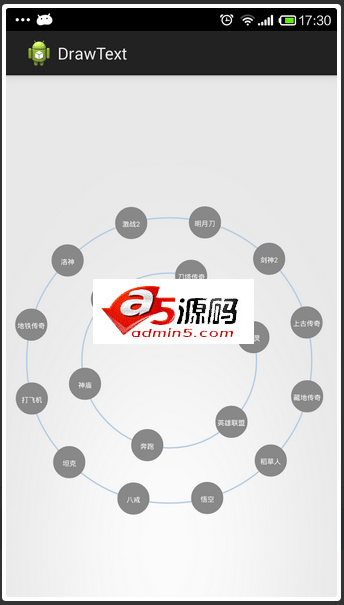 本例子是一个环形双层的菜单,可以根据手势的左右滑动,可以进行相应的转动,并且可以点击任意一个选项,动态效果类似于老式的老式的转盘电话,自己脑补一下吧。点击任何一个菜单会在logCat里面打印出当前点击项。