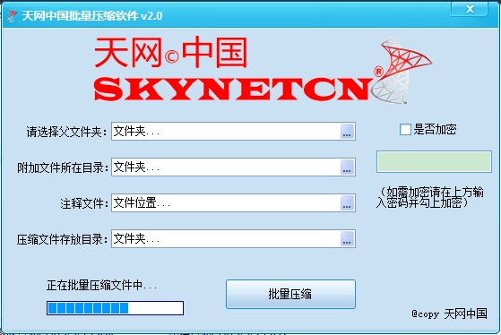 天网中国批量批量压缩是一种批量rar文件压缩工具,是使用方便的rar批量工具,体积小,可以对要压缩文件夹进行添加文件,添加注释,添加压缩密码,执行批量压缩。
