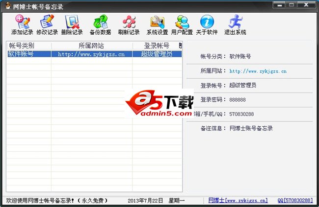 现在每个人的各类账号五花八门,本软件为单机版,专门记录各类账号,如QQ账号、微博账号、网页登陆账号、各种软件账号等,本软件可将这些账号归类整理集中管理,软件功能齐全,经杀毒软件检测均无毒,可放心使用,使用过程中如您有任何建议和意见请联系我,本软件永久免费,谢谢使用!