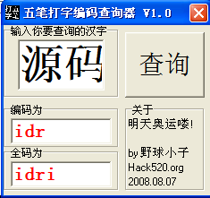五笔打字编码查询器,原理很简单的,利用了在线查询的数据库。小编用过了,很好用。这个五笔打字编码查询器不但适用于五笔初学者,同样也适用于老手。像我这样打了六年的五笔,有的时候有些字打不出来,因为怕麻烦,手头又没有可以直接查询五笔编码的工具,所以总是把输入法切换到智能ABC打的。从现在开始我也要把打不出来的五笔字全部消灭!