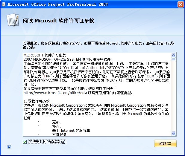 在“我接受此协议的条款”前的方框里点一下,然后点击“继续”,得到如下界面: