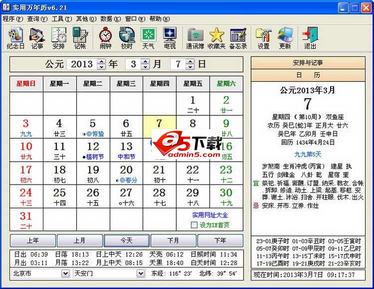 实用万年历是一款比较实用的多功能日历。日期计算等均采用了现代高精度天文算法。日期范围:从公元前4600年至公元10000年,历时近一万五千年。包括公历、农历、回历、历史年号、公农历节日、节气、干支(生辰八字)、生肖、星座、出梅入梅、九九三伏、28星宿以及中国传统黄历的内容等。