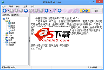 能说会道 XP 是一款面向专业用户的语音产品,内置独创的中英文双语内核,可以同时设置中文语音角色、英文语音角色及各自的朗读语速,解决了使用单个语音角色不能兼顾多种语言朗读的问题,是真正的中英文混合朗读,这在中西方文化日益交融的今天,显得尤为重要。能说会道 XP还具备[播放,暂停,停止,快进,快退,重复]的超强朗读控制功能,能够随意选择从文章的何处开始朗读,并内置重复朗读功能,可以让你重复聆听某些关键内容,加深理解,因此,能说会道 XP不光可用于阅读新闻、小说等普通场合,更可适用于需要丰富控制功能的语言学习等复杂场合。