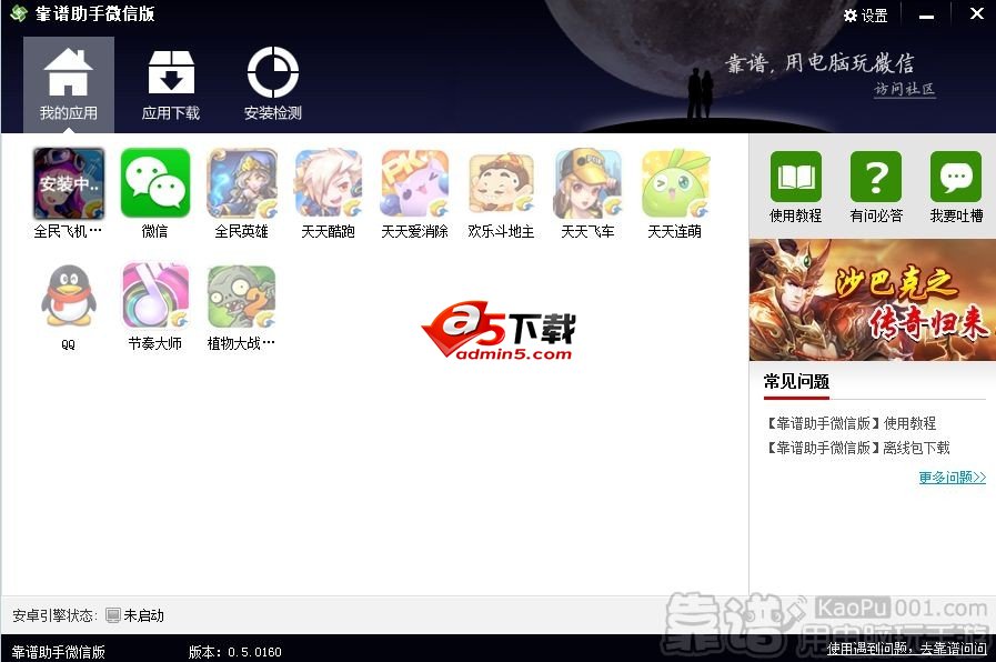 靠谱助手是一款可以让用户在Windows系统上体验安卓应用和游戏的超强大软件,靠谱助手微信电脑版是专为微信以及微信游戏推出的定制版本,不仅可以在电脑上玩朋友圈、摇一摇,更完美支持全民飞机大战、全民英雄、天天酷跑等微信游戏在电脑上的操作哦!