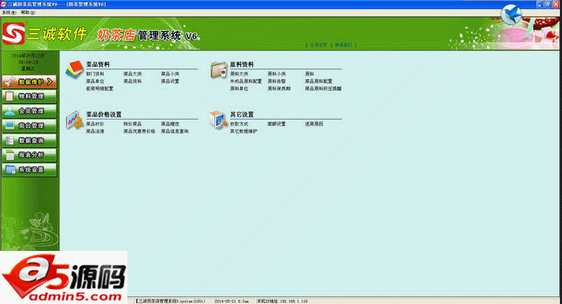 三诚奶茶店管理系统内置 营业设置、部门资料、出品部门、出品资料、出品设置、其它设置、开单备注、库存管理、营业分析、会员管理、经营情况、营业收银多个实用功能模块。