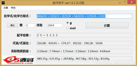 配平助手用于配平化学方程式、离子方程式、计算反应物和生成物的式量、质量、摩尔数。