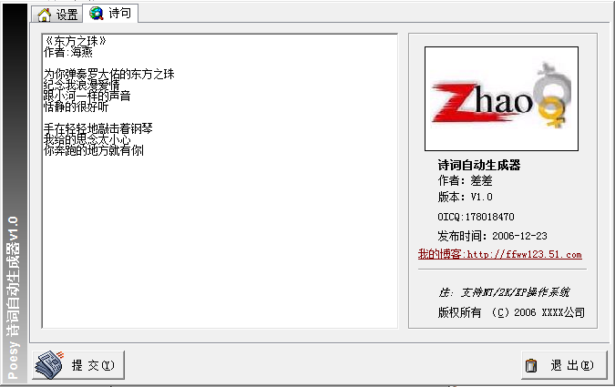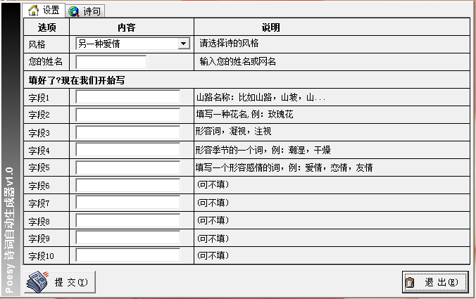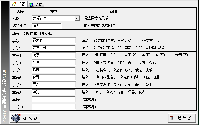 你是否因为写不出一首好的诗歌而苦恼;你是否因为诗的对仗而纠结不已;不妨你可以试试这款软件"诗歌生成器”。