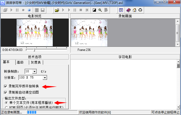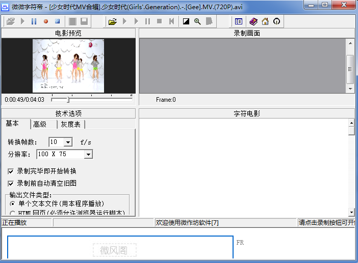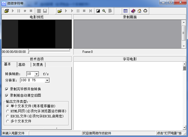 ① 如果输出为单个文本,则本程序将打开该字符电影文件(txt纯文本格式文件),用户可以在相应工具栏中点击“播放字符电影”或者“同步播放”按钮,播放该字符电影,用户需要点击本程序的“保存”按钮,把当前文本文件另外保存。