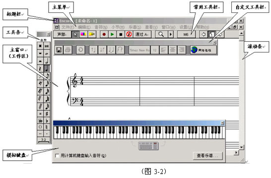 Encore4.5界面最大的特点,就是界面十分简洁,非常朴素,这也是区别于其他几个软件的地方。它的优点是界面简洁明了,没有专业学过打谱软件的人也能一用就会,它可以制作打印钢琴谱、带伴奏器乐声以及交响乐总谱等等一系列常用乐谱,基本上可以满足一般乐谱制作的要求。另外Encore自带音序器,可以通过音源(声卡)来播放乐曲,功能非常实用。Encore虽然看上去比较简单,但是它的功能却一点儿也不少。