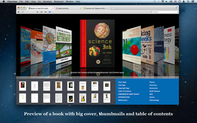 只需从包含电子书文件的文件夹拖动电子书文件或直接点击Clearview for Mac书架,所有的文件信息将被快速导入到库中,然后您可以从书架中轻松浏览,搜索和阅读的书籍。随着书籍文件夹和阅读列表相结合,你会发现,管理你mac上书籍是一件容易而有趣的事情。