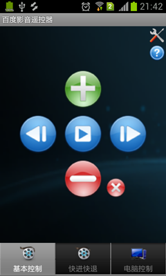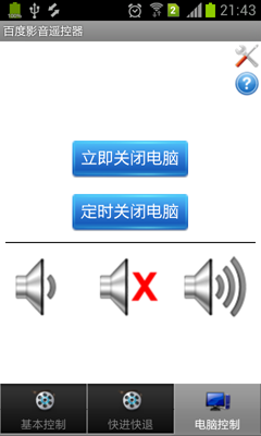 百度影音遥控器,手机遥控电脑。该软件配合电脑端软件,可以实现手机遥控电脑上的百度影音软件,可以对电脑上正在播放的视频进行播放暂停控制、音量调节及剧集切换。此外,该软件还具有调节电脑音量和设置电脑定时关机的功能。当你躺在床上看视频,听到不喜欢的视频时,只需轻松的摇一摇手机,即可切换到下一剧集;当你看着视频想入睡时,你无需再起身去操作电脑,只需轻松按一按手机,即可设置电脑定时关机或者立即关机。