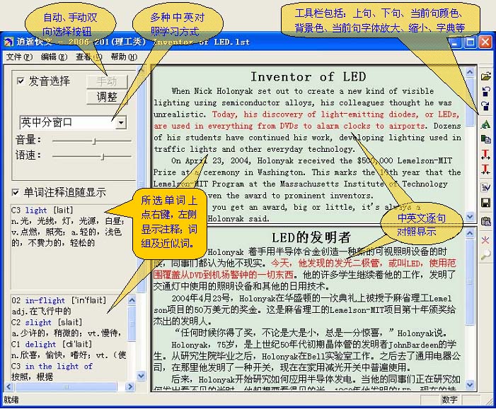 职称英语轻松过-综合类教材通紧扣教材,提供全文翻译对照、句翻译对照、词翻译(提供单词等级)对照功能,轻点鼠标,词词相对,句句呼应;如果选择发音,即可逐词逐句逐文,边看边听,还有自动浏览、速度设定、统计词频等级、单词真人语音等多种功能。