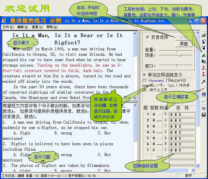 职称英语轻松过-2015练习(理工类)提供教材全部英文课文、课后练习、词汇选项及答案,含全部大纲词汇,单词即时查询。在全复习情况下,110篇英文课文,只需5.5至8个小时即可浏览识读一遍。本软件还可与‘职称英语轻松过-教材通’软件(提供全部教材中英课文,逐句、逐段中英对照)联用,满足个性化需求。