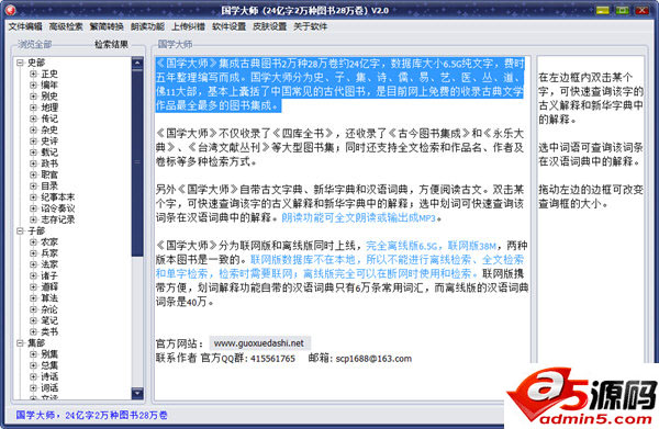 《国学大师》集成古典图书2万种28万卷约24亿字,数据库大小6.5G纯文字,费时五年整理编写而成。国学大师分为史、子、集、诗、儒、易、艺、医、丛、道、佛11大部,基本上囊括了中国常见的古代图书,是目前网上免费的收录古典文学作品最全最多的图书集成。