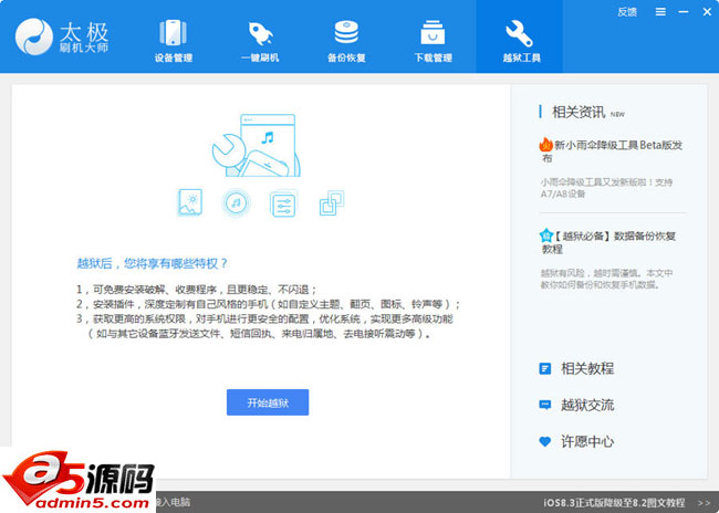太极刷机大师是一款集手机恢复、数据备份、数据找回等多种功能于一体的软件,适合经常刷机越狱、数据丢失的同学。使用太极刷机大师可以一键刷机,一键备份数据,方便快捷。太极刷机大师提供了四种刷机模式,普通刷机模式、保留数据刷机模式、iTunes备份刷机和iTunes完全备份刷机模式,四种模式各有特点,用户可根据自己的需求来进行不同形式的刷机。