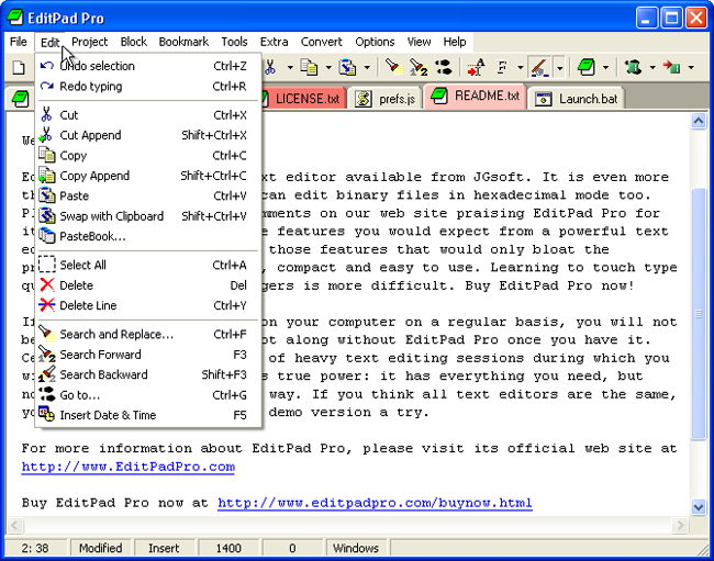 一个很好地替代Windows NotePad 的程序,功能和效果都不错。它具有许多有趣的特点,包括在给定时间打开你想要打开的文件。在打开的文件之间进行转换只需点击它们的标签,进而消除了大量窗口重叠的繁乱感。EditPad 不需要任何额外的动态链接库(DLL)。