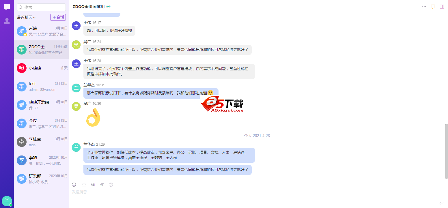 喧喧是由ZDOO协同团队推出的一款轻量级、开源开放的企业协同聊天软件。