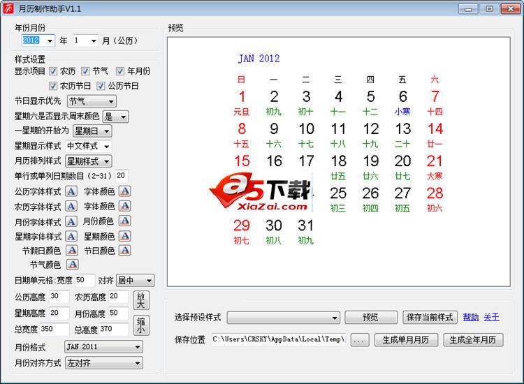 通过月历制作助手制作月历,可以自由选择是否需要农历、节气、节日等,可以设置字体、颜色、字号、尺寸等,并且有星期、横、竖三种排列样式。生成PNG透明图片方便二次加工。软件需要.net framework支持,所以使用前先确认您的系统安装有.net framework。