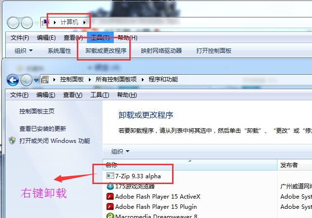 或者依次打开我的电脑->卸载或更改程序->卸载你所卸载的软件,您可以用 Window XP控制面板中的添加或删除程序功能,或用 Windows Vista、Windows 7中的程序和功能删除7zip , 然后点击开始卸载。