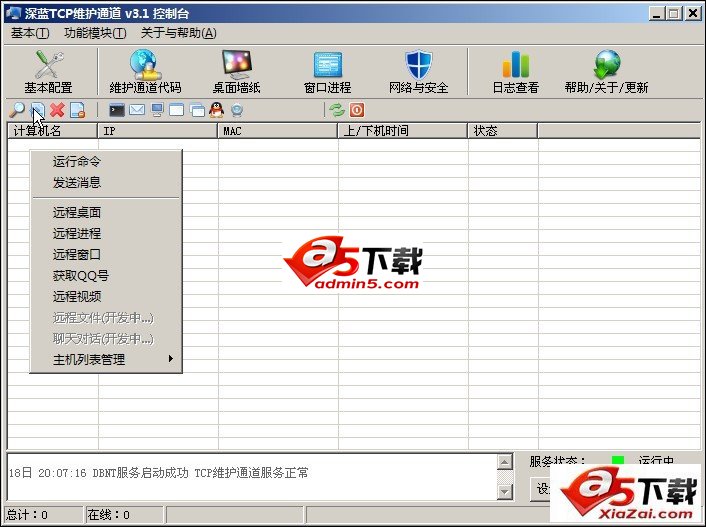 深蓝TCP维护通道 是一款在已经做好系统后,即时对网吧客户机(或企业局域网客户机)系统 统一进行改变、更新、升级、维护、控制的网吧维护工具。使网吧维护(企业维护)更智能、专业。