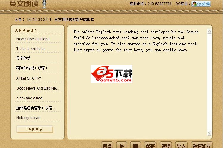 详细介绍:本工具为英文在线朗读工具,朗读语音流畅,有一定的感情色彩。无需下载语音库,可以朗读任何文字性的内容且没有字数限制。大家可以用他来读新闻、读小说、读文章,更重要的是你可以利用本工具练习英语发音、听力,学习不掺杂任何中国式口音的纯正英语。