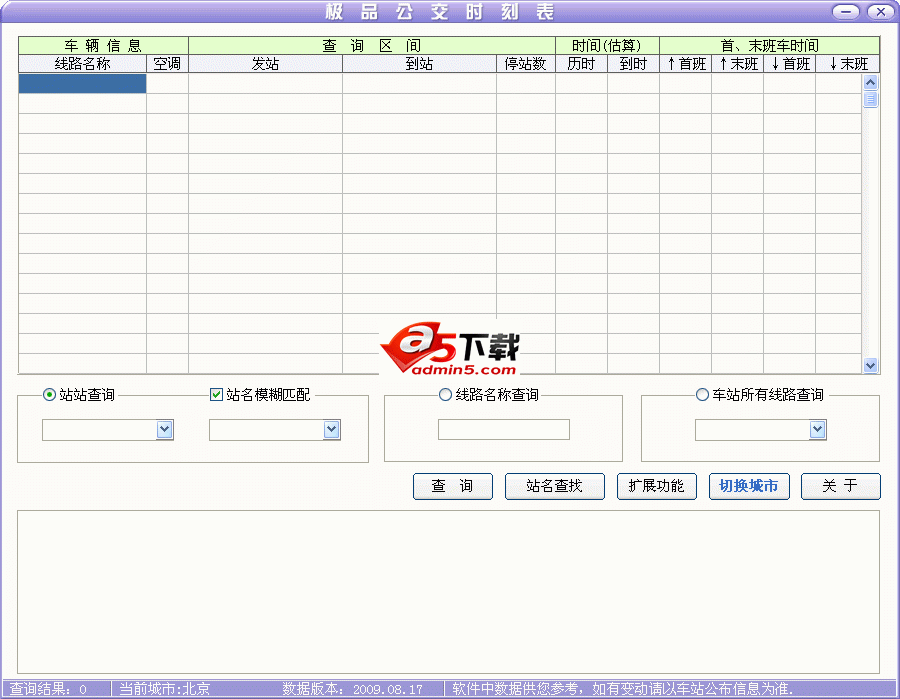 极品公交时刻表是北京极品时刻科技有限公司于2008年1月17日推出的新查询软件。 极品公交时刻表特点如下: 1、单机版软件,无需联网即可运行! 2、输入站名时,支持[站名拼音首字母输入法],输入迅速! 3、体积小巧,仅300余k! 4、纯绿色软件!! 5、数据更新迅速!!