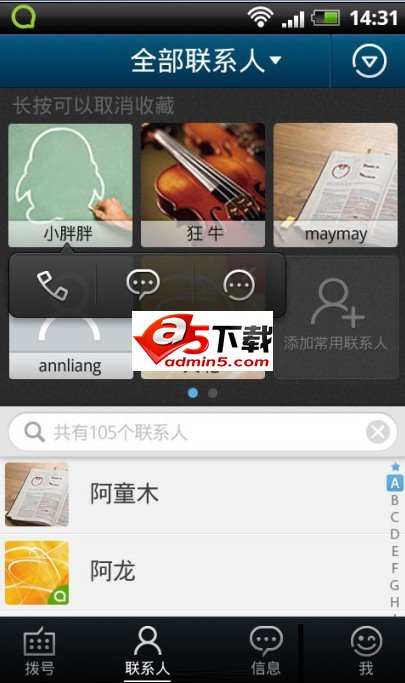 QQ通讯录,提供联系人智能查找,网络同步,短信聊天等便捷功能,支持动态称谓短信(群发时自动匹配收信人姓名),同时还提供春节元宵节日种子短信,短信拜年必备工具。QQ通讯录强有力地弥补了手机自带通讯录的不足,不仅能快速搜索名片和拨号,还能便捷查阅、发送短信,显示联系人归属地,同时提供多种常用号码,方便我们的生活。
