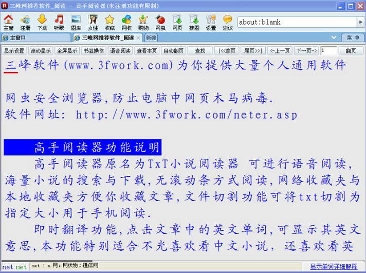 高手阅读器是一个集成txt文件,txt小说阅读与txt小说下载的工具。具体的功能有