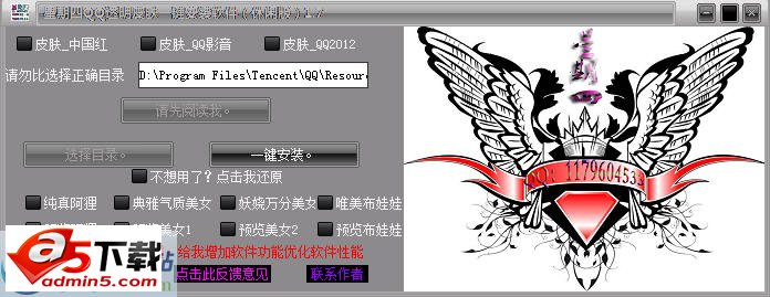 qq透明皮肤下载2012一键安装真正的做到了一键透明,不用用户手动选择目录,而且安全无毒!这个版本为了减小软件体积,所以去掉了,多个补丁选择,如果需要的话也可以去下其他版本,!