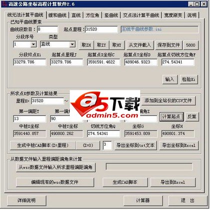 高速公路坐标高程计算软件应用于公路、铁路、等坐标高程计算,可用来计算桥梁桩基、立柱、支座垫石、护栏、桥面系及涵洞通道坐标高程,可计算试车场高速环道布劳斯曲线坐标,是施工放样和图纸坐标高程复核的好帮手,还可以用来复核工程上广泛应用的可编程计算器CASIO 5800坐标高程避免出错。