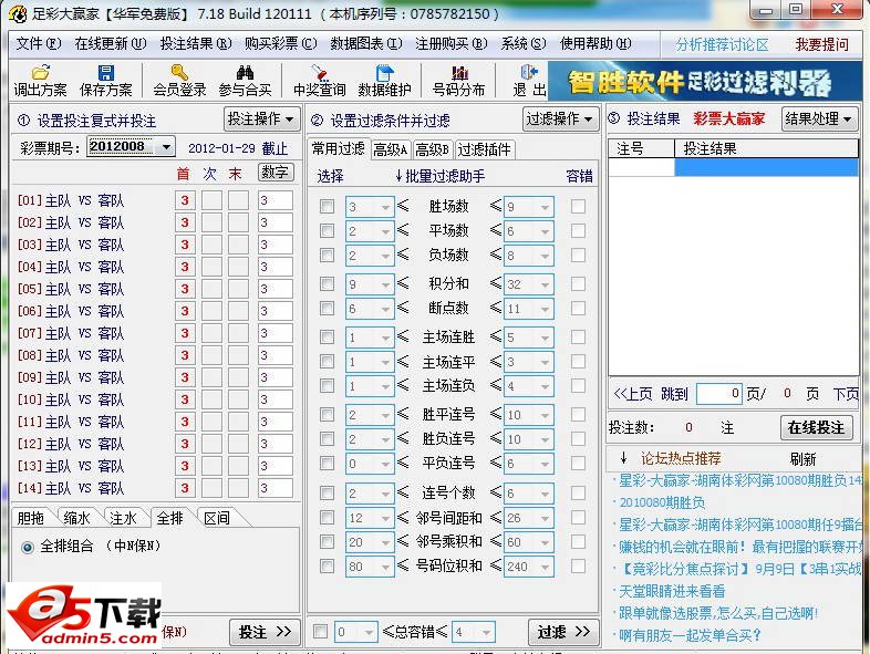 《足彩大赢家》是目前国内最专业最知名的足球彩票分析软件,专门针对“足彩胜负彩十四场”“胜负彩”玩法研发面世。 它将您的足球专业知识和电脑智能有机结合,通过叠加、胆拖、过滤、缩水等手段,大大减少了您购买“垃圾注”的数量,目前75%的百万大奖都通过该软件过滤而得。