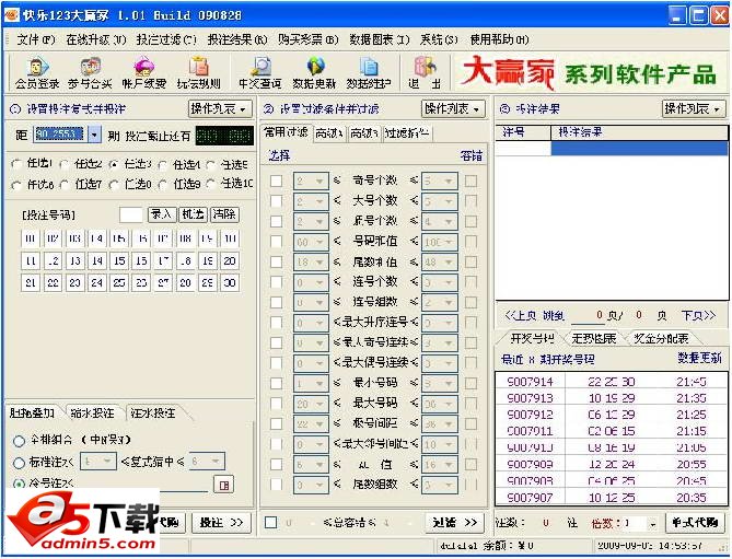 提供和值过滤、类型过滤、加胆过滤、特征过滤、开奖过滤、交集保留、交集滤除、二码过滤、匹配过滤等 过滤条件,帮您最大限度地滤除垃圾购彩。过滤检验功能可对用户设置的过滤条件进行检验,检查过滤条件设置是否错误,并及时进行总结和修正,大奖尽在掌握。