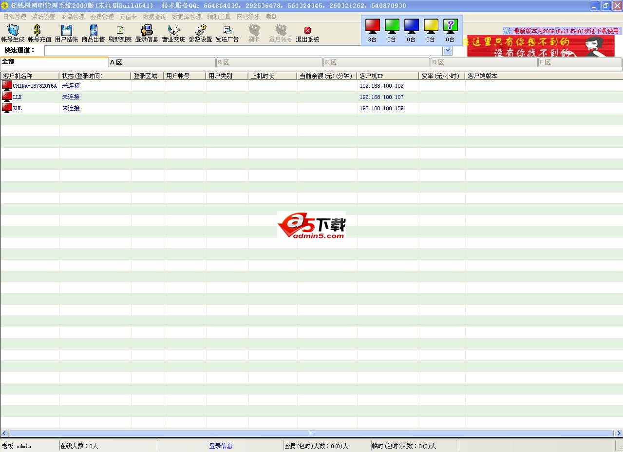 摇钱树智能管理软件集合多款网吧机房计费管理系统的精华,具有灵活多样的费率设置、强大的会员管理、普通用户管理、商品管理、远程监控、连锁网吧管理、详细的上机记录及冲值加钱记录功能,可实现用户自由择机、连锁网吧使用,支持远程查账、统一安装,远程客户机唤醒等众多功能,是大中小型网吧智能管理计费的理想选择。