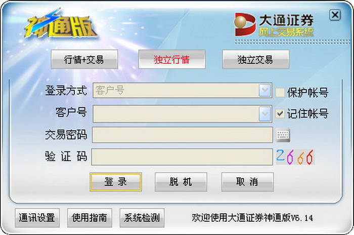 大通证券神通版通达信新增融资融券业务功能;支持股指期货行情;支持付费十档行情;可以设置绿色透明代理,用来通过局域网的防火墙;使用交易帐户登陆行情资讯系统时,可以看最新的《大通研究》报告,还有即时信息提醒随时提供专业资讯。