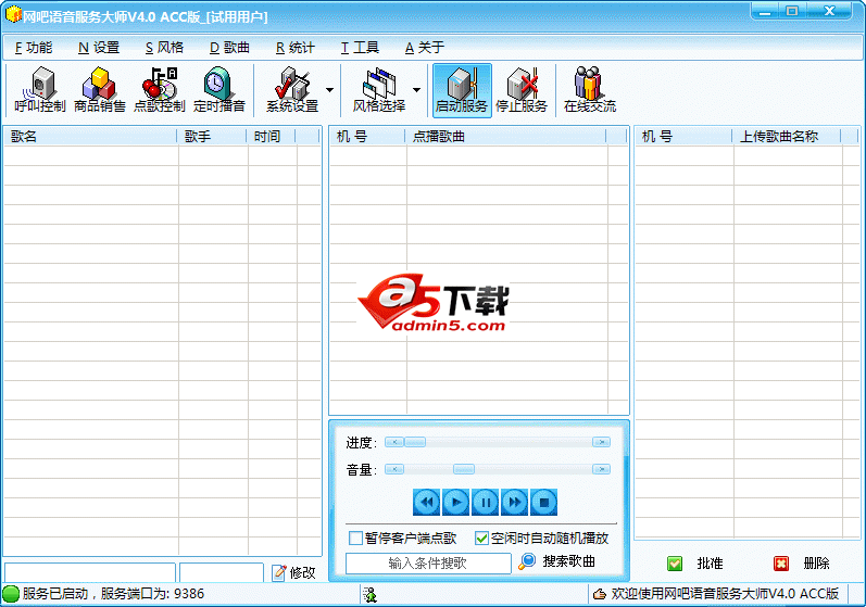 网吧语音服务大师原名蓝宝石呼叫网管系统,本软件经过一年的不断开发和改进,成功使用的网吧近5000家。目前功能性、实用性、稳定性、应用范围等方面都遥遥领先于同类型软件,几乎可以满足网吧所有语音呼叫的需求,是名副其实的网吧语音服务大师。集成语音呼叫网管、呼叫服务员、文字呼叫、呼叫技术员、商品销售、网吧点歌、网吧公告、定时播音、服务台呼叫、空机提示、发送消息、客户端歌曲播放、客户端批量上传歌曲等诸多功能于一体,适合各类型的网吧应用。本程序服务端具有强大的设置功能,能根据你网吧的实际情况,设置你自己的呼叫方案;可以进行有声、无声、真人发声等各种类型的呼叫;可以根据网吧实际情况,自由设置客户端显示的相关功能;可以正确的报出任意长度、任意数字字母组合的机器号;可以设置各种定时播音;可以发送各种消息和公告;可以批量在服务端审核批准客户端上传的歌曲;本软件的所有设置和对客户端的控制均在服务端程序上进行,客户端程序几乎不用作任何设置,非常方便网吧进行集中式管理!