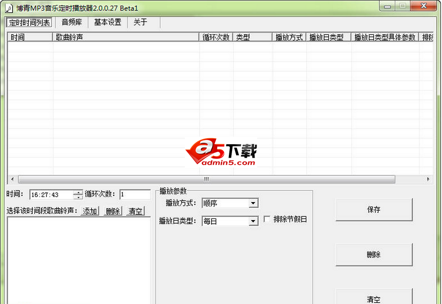 音频文件定时播放器闹铃根据设定的时间自动播放,可以自由方便的设置多个时间段,每个时间段可设置多首音乐,并可设置循环播放次数。