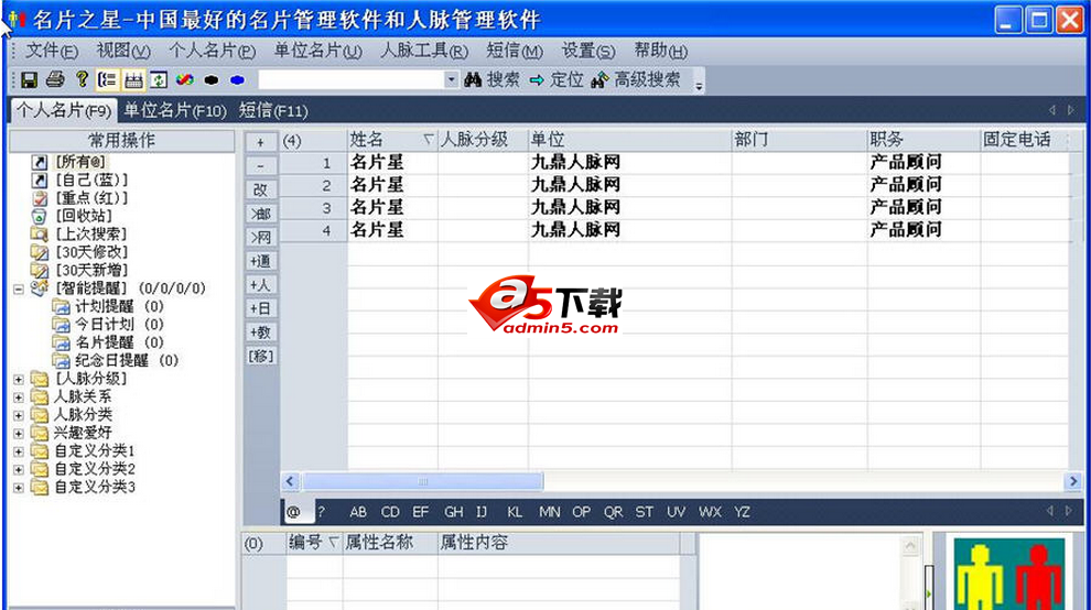 名片之星能实现人脉管理三个层次目标:1、初级:管好所有人的联络信息,保证随时取得联系。2、中级:管好重要人的隐含信息,保证快速了解和挖掘人脉。3、高级:管好关键人的行为信息,保证及时沟通感情和增加信任。