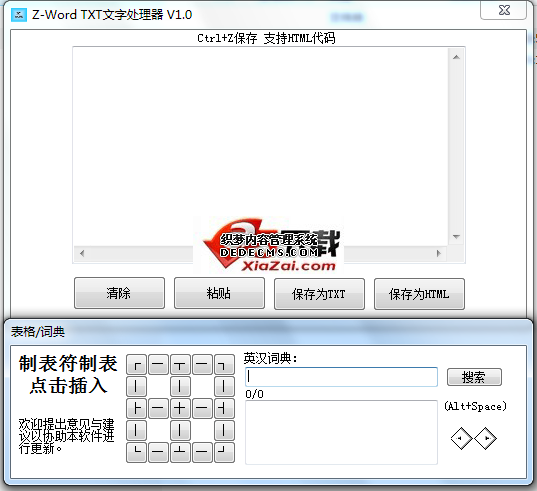 Z-Word TXT文字处理器是一个实用、便捷的TXT文字处理工具。支持英汉、汉英词典,制表符制表,将HTML代码保存为网页...体积小巧,只有主程序及词典文件,方便携带。