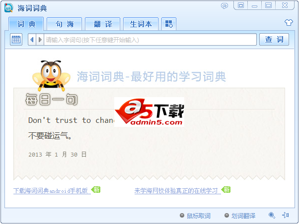 海词词典是中国第一个在线词典品牌,比金山词霸早两年创立。从2003年创立以来一直专注于网络词典创作,词条的准确度、可理解性是我们不断追求的目标。海词多年来为很多大公司提供专业词典服务,包括百度词典,有道词典,腾讯QQ词典,灵格斯词霸等。2012年11月,牛津词典(中国)主编于海江发来海词9周年贺词:“学海无涯,海词为舟”,祝贺海词在学习词典领域所取得的成就。我们认为词典不应该是翻译工具,而应该是在漫漫学习路上最出色的答疑解惑助手。