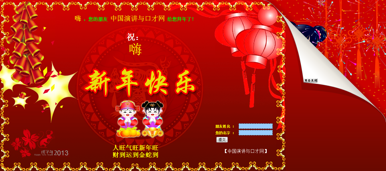 此套程序是单纯是html组合页面,增加了新年背景音乐以及贺卡动画,修改起来比较方面,只需上传程序便可,顶部图片自行修改。希望大家会喜欢,也祝大家2013年新年快乐!蛇年大吉!