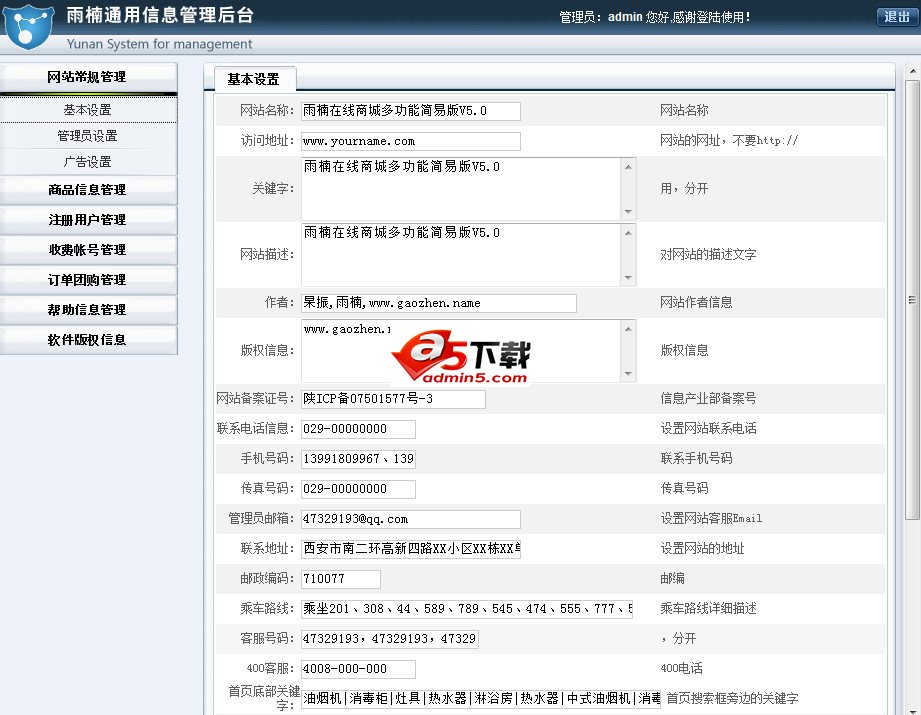 常用参数设置:基本设置、管理员设置、广告设置、系统探针