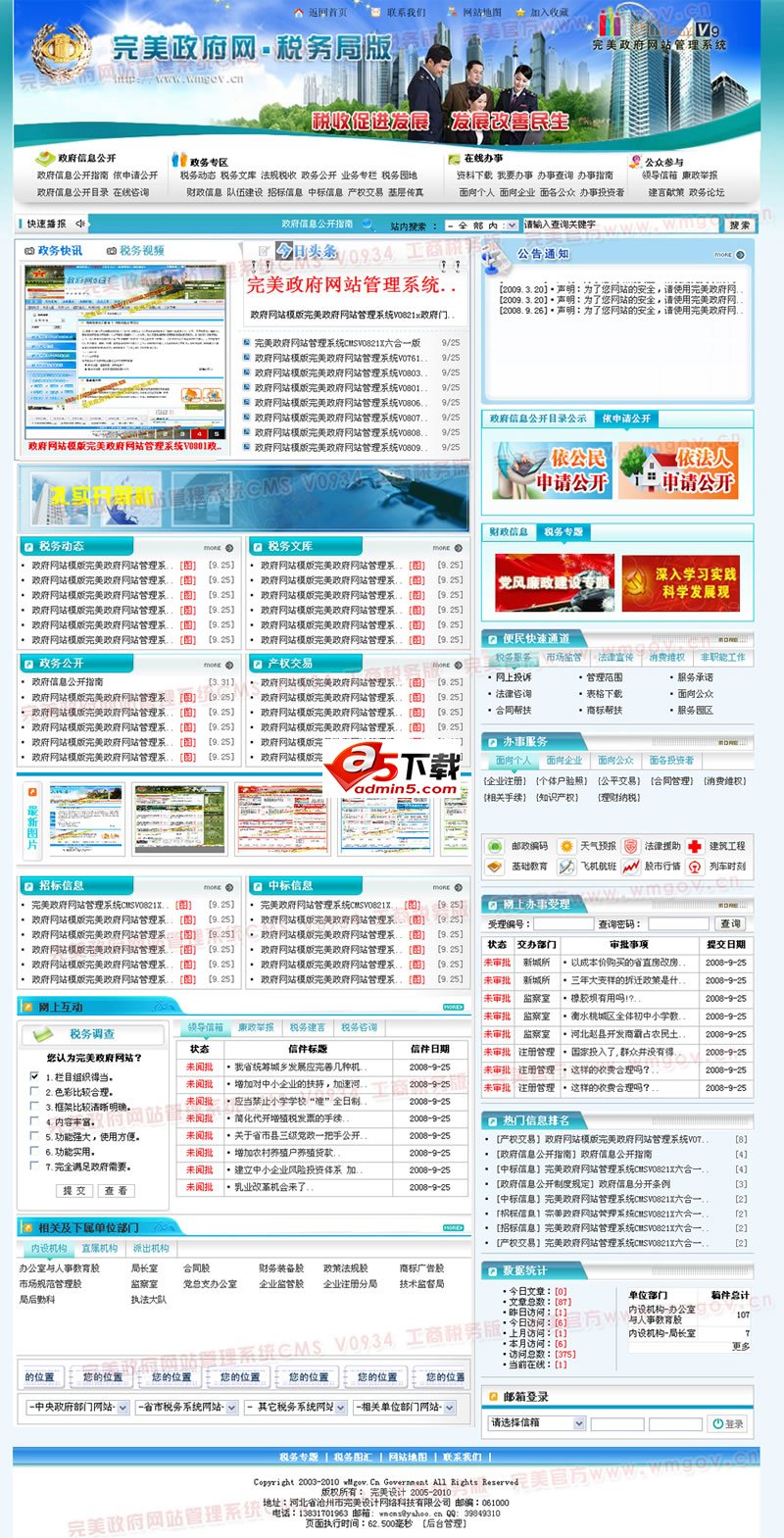 完美政府网站管理系统 WMCMS0934工商税务版。此版全站采用DIV+CSS构建,静态生成,使网站速度加快,网站更容易维护,搜索引擎更容易收录达到推广的效果。 优化了程序代码,修复以前版本存在的问题,功能模块加强。此版本完全按市县政府门户网站的功能需求进行定向开发设计,网站根据《中华人民共和国国务院令第492号》要求集成了政府信息公开功能模块,同时按《政府门户网站考核评公办法》集成政民互动功能模块(领导信箱、建言献策、投诉举报、公众留言等)、百件事网上办功能模块、办事审批功能模板、图文媒体视频功能、公文发布、哀悼日一键设置功能、政府领导等功能模块,满足政府门户的需求。设计中采用大气的中国红色调辅以清淡色块处理,使网站整体庄重稳健又不失活力。网站系统为CMS智能内容管理平台,栏目及菜单后台设置,操作便捷,会打字就会建站,同时随正式版提供丰富的PSD源图及FLV源文件,方便进行二次设计。