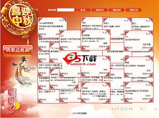 2013中秋送祝福程序 中秋降至,马上可以派上用场了。修复了一些小BUG,直接上传即可使用! 程序采用AJAX无刷新技术发布祝福和管理列表,时尚弹出框将给访客带来最佳的用户体验。
