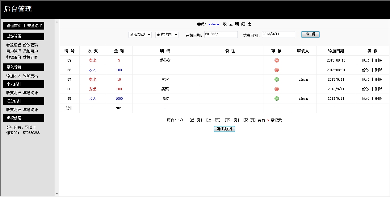 3.管理员帐号登录可以审核所有帐号下的账目,审核后的账目普通会员无法修改和删除