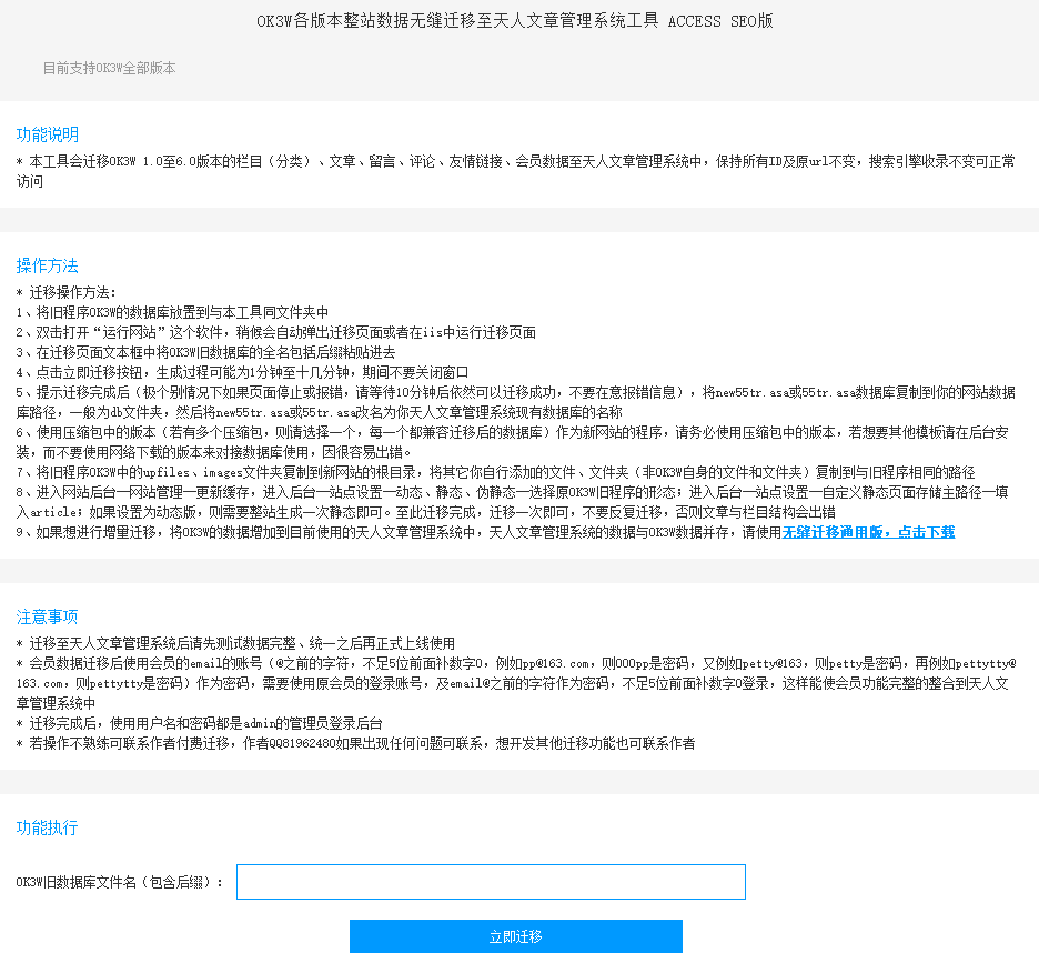* 本工具会迁移OK3W 1.0至6.0版本的栏目(分类)、文章、留言、评论、友情链接、会员数据至天人文章管理系统中,保持所有ID及原url不变,搜索引擎收录不变可正常访问