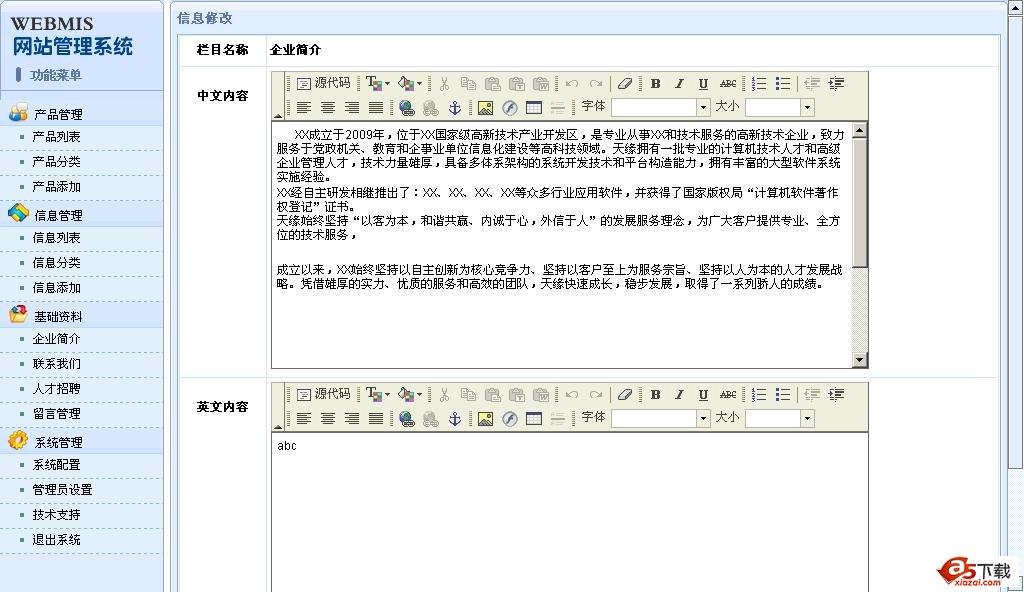 该系统为免费版,由天缘网络整理并重新编写。中英文界面,基本功能应有尽有。欢迎大家交流与学习。 功能有:站点信息设置/信息管理/产品管理/管理员设置/留言管理等。