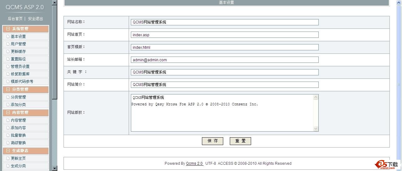 QCMS是一个小型网站管理系统,灵活,方便是最大特色,为初学者快速度架设网站首选。ASP+ACCESS,只要一个ASP空间即可直接架设,无需更多复杂的操作,程序开源,模版分离,动态标签,只要会HTML就可以做出个性化的网站。