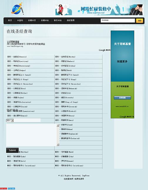 个人认为,该程序写的非常好。可以查询新约,旧约的每一章节的每一段落的中文与英文内容。适合基督徒们查询使用。(本人不是基督徒) 后记:这是“在线查询网”一月以来发布的第26个程序,也算是短期内发布的最后一个程序。由于时间所限,以后不会再这样连续的公布程序了。年内,将会有数十个新的查询项目陆续在“在线查询网”添加,有需要代码的可以跟本人联系。