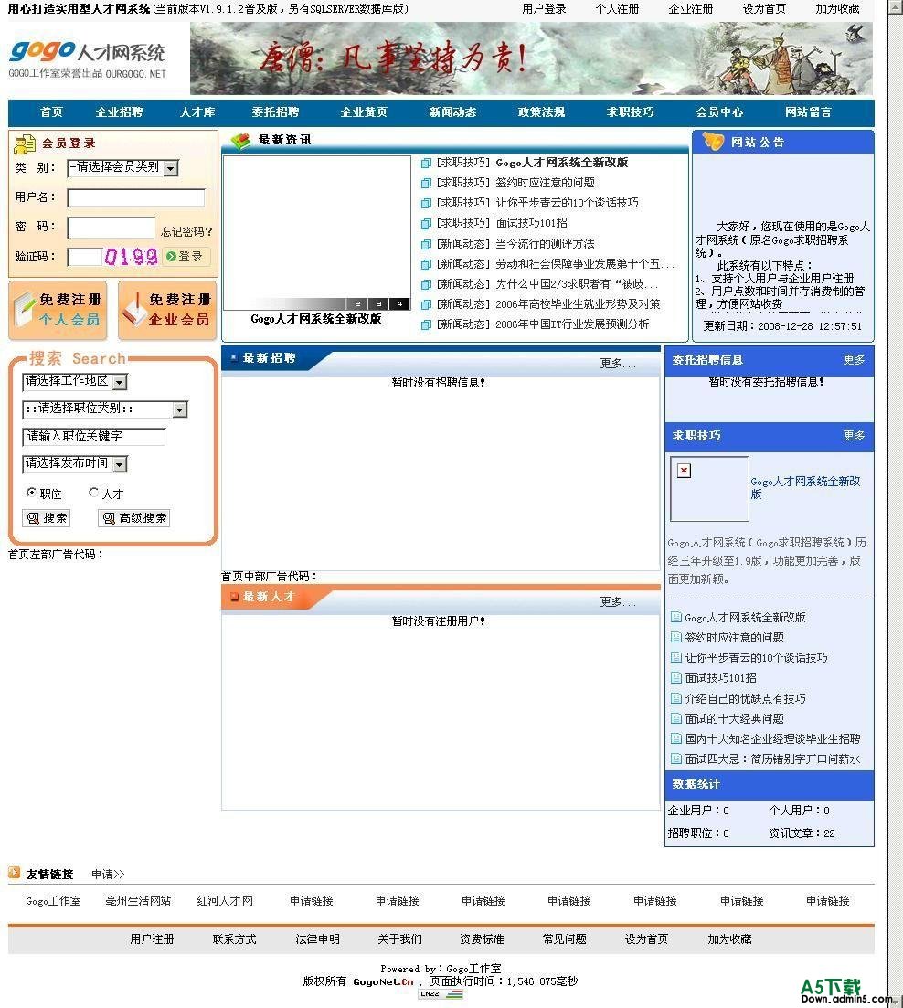 6、强大的用户互动功能:支持个人职位库、企业人才库、站内短信、邮件(支持后台群发)、人才职位高级搜索、简历投递