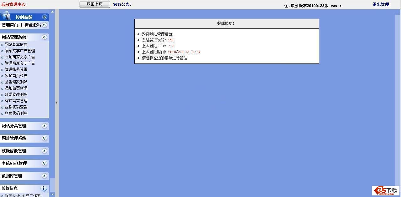 包括全站自动审核功能,关键词拦截,非法网址拦截,后台自主设定,全站广告自动更新功能,后台常用维护功能:(如,删除所有未审核的网站,开通所有有点入的网站,删除所有重复提交的网站),今日来路排行榜,删除所有网站的来路统计,删除所有网站的去路功能,删除所有用户昨天点入功能,新增:管理实用查询、管理名站导航、管理友情链接、最新加入、最新点入、最新点出、点击排行、客户留言板,展示地址功能等功能!